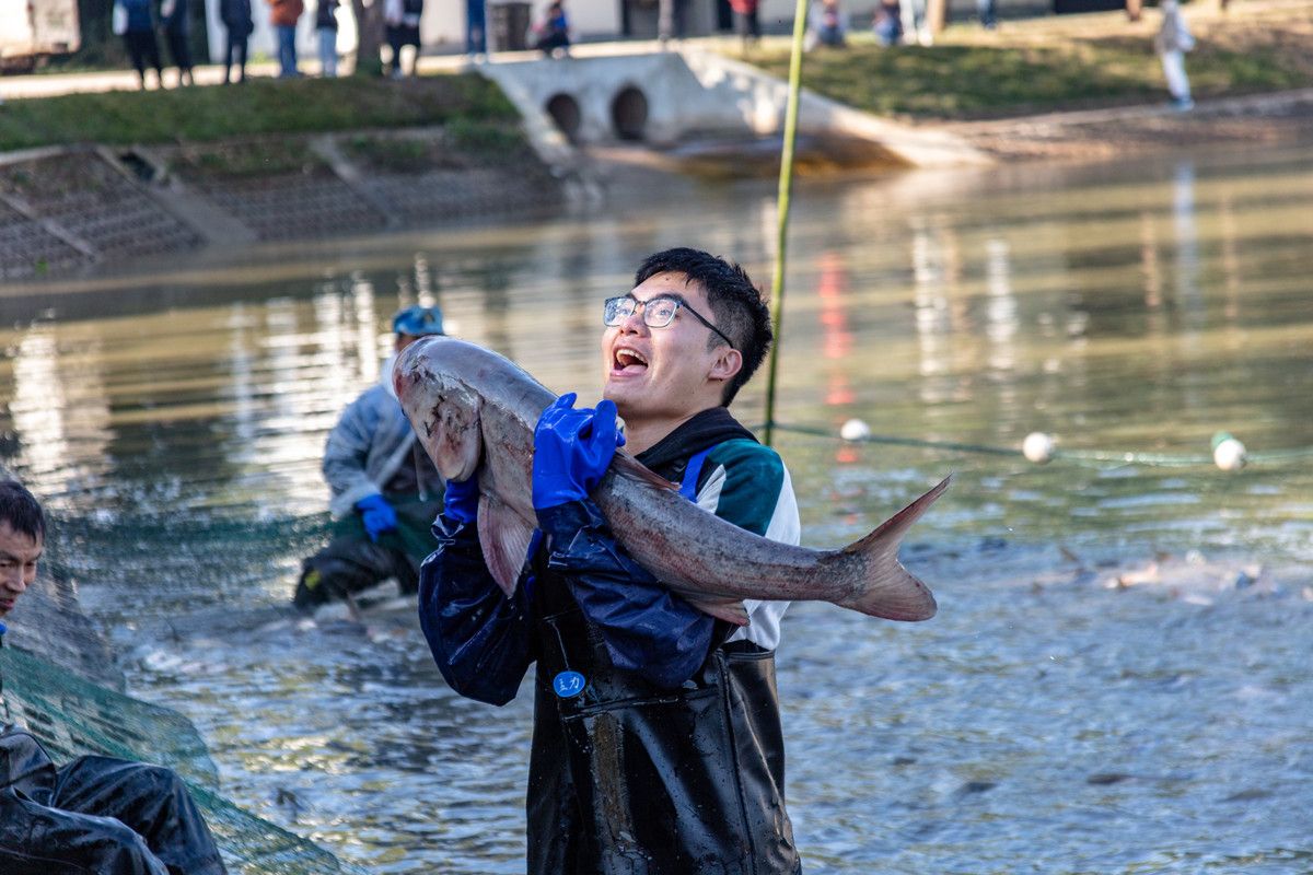 在岸边围观捕鱼的学生中,艾尔卡木·阿不都热依木身着捕鱼皮裤,走向渔网中央,半弯下身用手在水中不断摸索。忽然,他手向下探,猛一捞,掐着鱼的腮部就将一条鲢鱼拎了起来。
