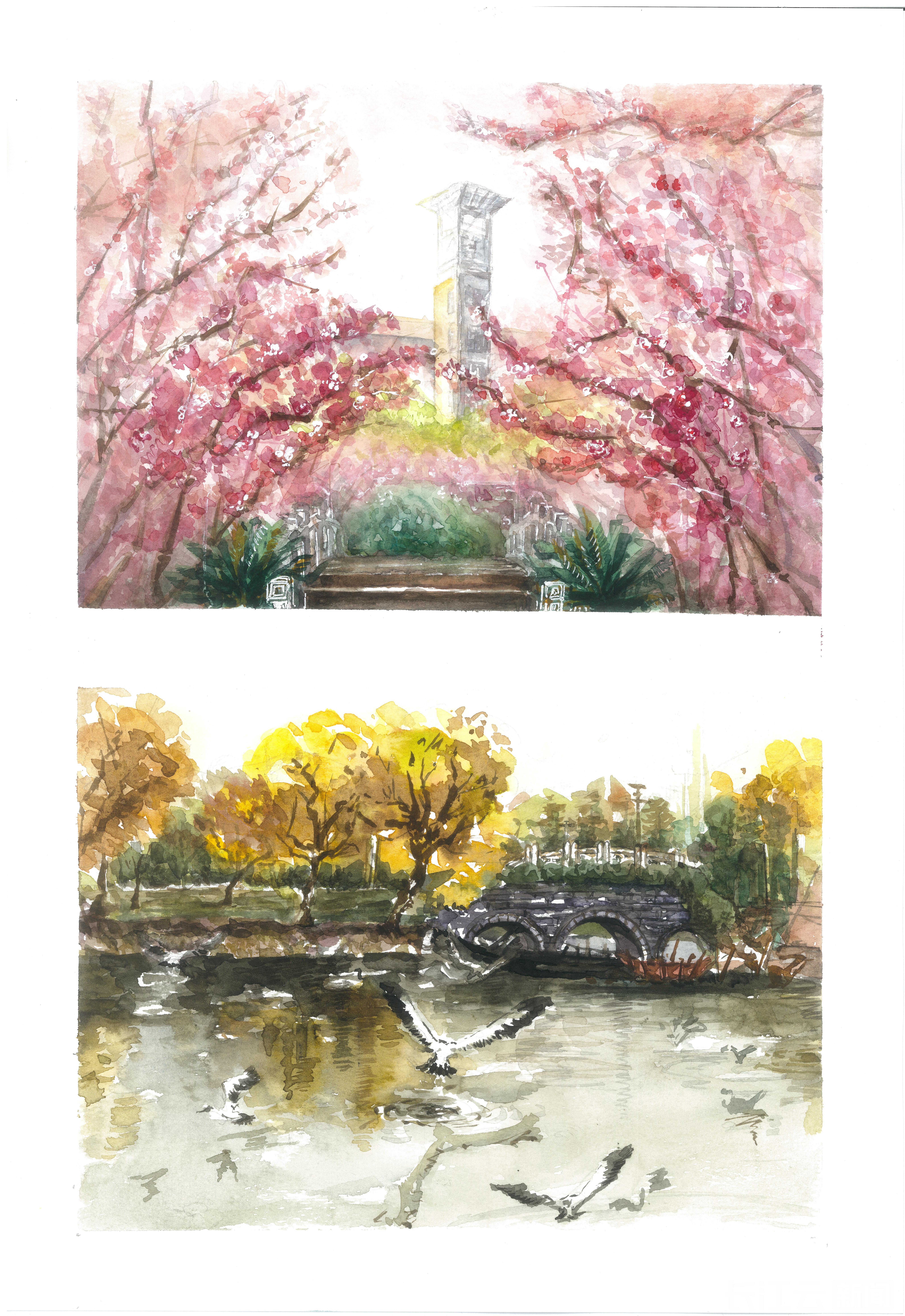 “偶然的一天,我体验了从春天到冬天的温度变化,于是萌生了以四季为主题去展现校园风景的想法。”《四季科大》作者之一、艺术类专业的杨天玮分享道,他和朱敬选择了武科大“钟楼”“沁湖”“谢师亭”三个标志性建筑,传统建筑与现代建筑遥相对应。他们以时间为线索,用粉、黄、绿、蓝四种色调描绘出武科大的春夏秋冬,展现四季变换。杨天玮感慨:“四季更迭,时光流逝,有很多变与不变,变的是武科大每一届学生的面孔,不变的是沁湖文化和钢铁精神的校园特质。”