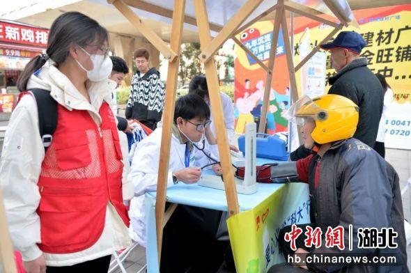 在健康义诊区域,必赢nn699青年志愿服务总队把健康义诊的设备摆出来,就有居民前来测量血压,咨询心肺复苏急救的方法。