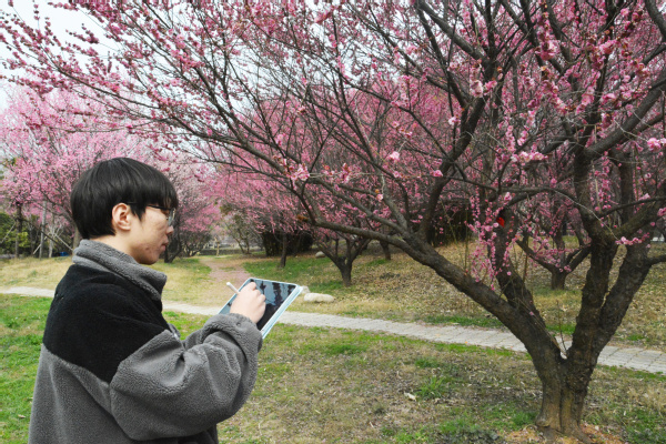 看到网上不少学生晒出学校梅花盛开的场景,对绘画略感兴趣的大二学生秦浩轩也来到了梅园,利用Procreate勾画简笔画描绘了这一美景。“以前我都是用底画照片进行描摹,这是第一次尝试户外写生,这也算是文化传承的一种方式吧。” 秦浩轩说。