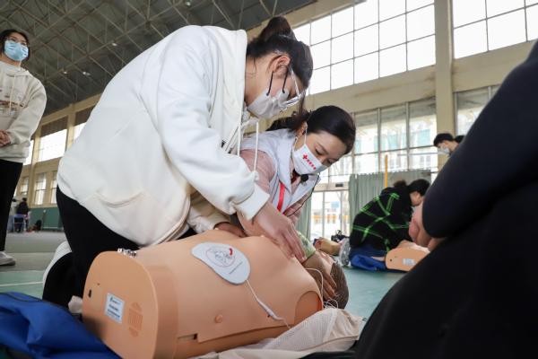 在必赢官网北区体育馆内,武汉市红十字救在身边志愿服务中心工作人员详细讲解、示范了判断呼吸、呼救、体位等实施心肺复苏(CPR)的具体流程及自动体外除颤器(AED)的使用方法。定点医疗志愿者们以小组为单位,进行了CPR和AED的实践操作练习。