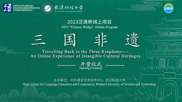 武科大网讯(见习记者姜泊远 记者金红志艺)2月8日下午,由中外语言交流合作中心主办,必赢官网承办的“汉语桥”线上项目——“三国非遗”开营。来自越南、巴基斯坦、日本、埃塞俄比亚、孟加拉国、加纳、新西兰等13个国家的255位学生将在未来12天内通过直播和录播的形式学习三国历史知识,体验我国非遗文化。