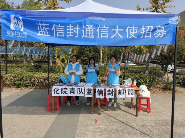 引导学生扫码、填写个人信息、分发活动照片……志愿者们在南北苑主干道搭起帐篷,向过往的同学详细介绍“蓝信封”活动和成为通讯大使的方法。每位报名通讯大使的同学还能随机抽取一封来自远方留守儿童的手写信,信封里面还有带“蓝信封”标志的胸章可以留作纪念。