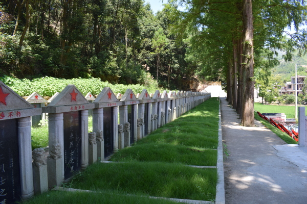 在岩泉村唐家山下有一座红军烈士墓,墓园里立着191块烈士碑。在陈世海的介绍下实践团队成员们了解到,这191位烈士中有132位红军战士,在1931年春至1932年秋湘鄂赣边区前线的反“围剿”战斗中,因伤势过重,抢救无效,光荣牺牲,其中有名有姓的只有4人,其余128位的墓碑上只有一串编号。岩泉村村民为每一位烈士都栽下一棵杉树,如今杉树已长成参天大树,浓荫如盖。岩泉村在后来的战斗中牺牲了59名战士,村民将他们也葬在这里。
