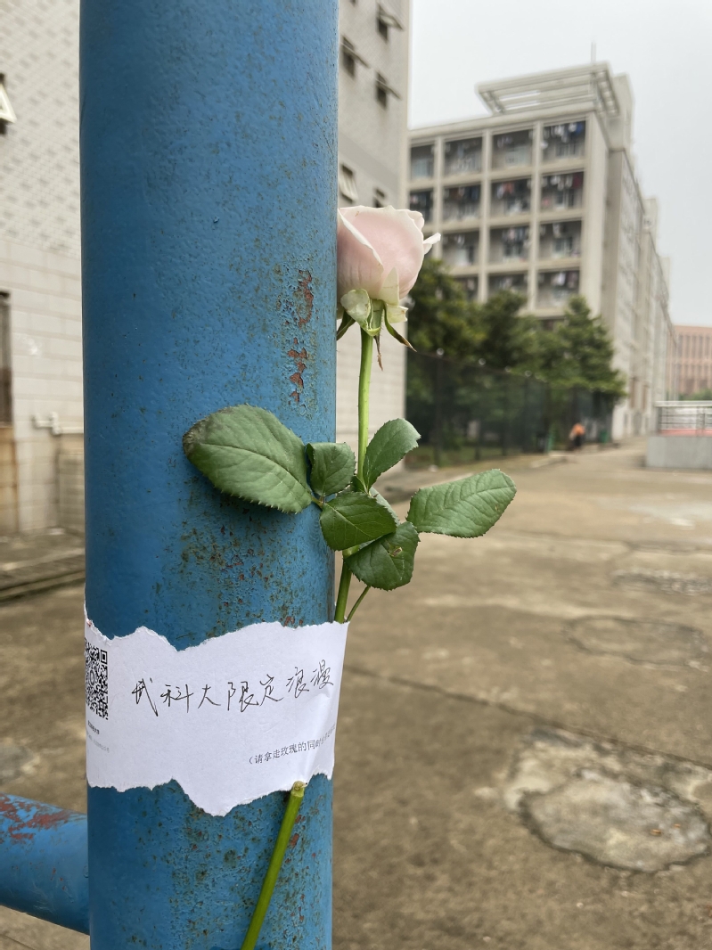 活动开展不到半日,玫瑰花已悉数送出。工商2109班的学生梁晓摘下了一朵绑有“请保持热爱,奔赴下一场山海”的玫瑰花,“这些玫瑰花让我感受到了学校对我们的关心,第一次看到带着祝福的花朵真的让人很惊喜和感动,希望学校可以多多开展这种活动,这是属于武科大人的浪漫。”
