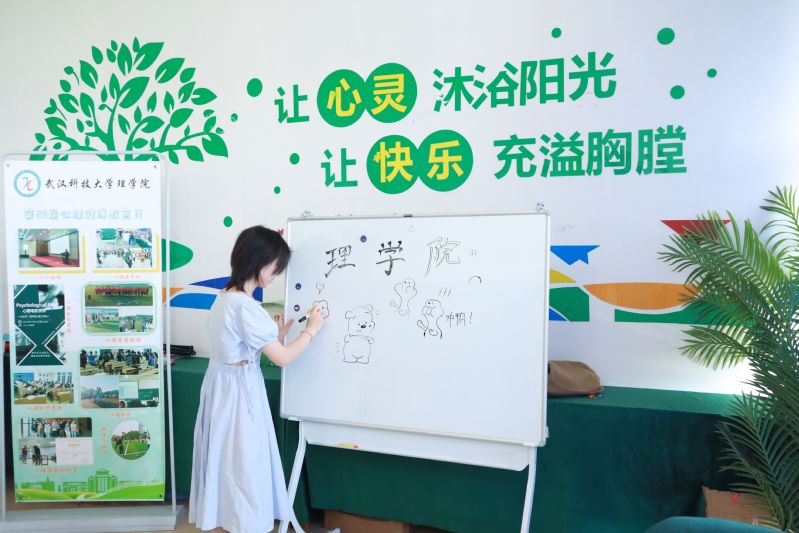 进入理学院心理工作站,房间四角都放置了清新的绿植,两张干净的桌子整齐排列于中央,桌上明媚的向日葵使人心情愉悦,左边地面上摆放着的蒲团坐垫围成一个圆圈,右边则放置着书架,工作室的墙壁上还挂着许多文艺的装饰品。“在整体布置上我们会选择一些提高学生倾诉欲的装饰,比如柔软的蒲团坐垫能帮助同学们袒露心声,这些墙上的装饰品也能缓冲到访者的压力。”理学院2018级本科辅导员胡晶晶解释道。