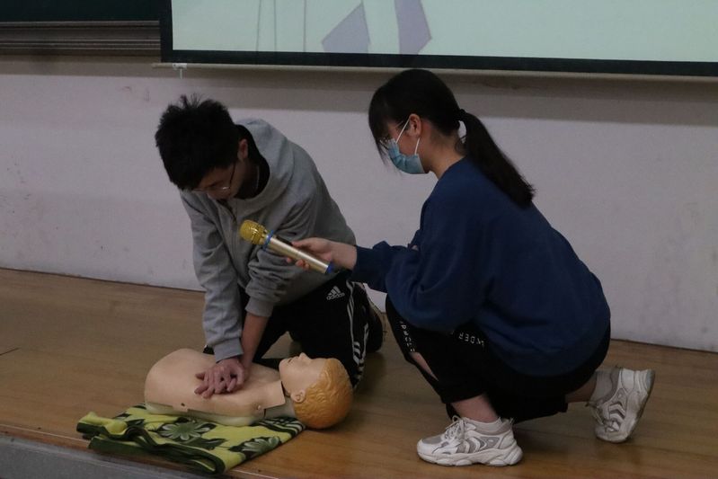 “现场环境安全,做好自我防护。先生!先生!您怎么了?快来人啊!我是救护员,现场有人会急救吗,请与我一同施救。1001, 1002 ,1003……初级救护完成,等待高级救护。”随着一号选手张晨展示了现场心肺复苏,比赛进行到了“现场急救”环节。选手们亲自上场,现场模拟心肺复苏、烧伤包扎方法等急救相关技能。来自化工学院的六号选手李文睿感慨道:“急救是刻不容缓的,经过这次比赛,我们也体会到了医护人员在争分夺秒进行急救工作时的紧张与辛苦。”