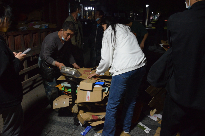 路灯下,许多志愿者忙着将纸盒、旧书以及塑料瓶分开清点。统筹安排、计算瓶子数量、打包捆绑纸制品、打扫现场卫生……这次活动共有100多名志愿者参加,持续了4个小时,一共卖出3000余个塑料瓶、400余公斤旧书和快递盒。此次回收所得的577元将全部捐给孝感市大悟县余河学校。