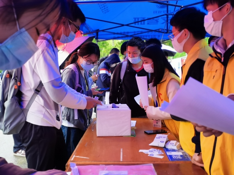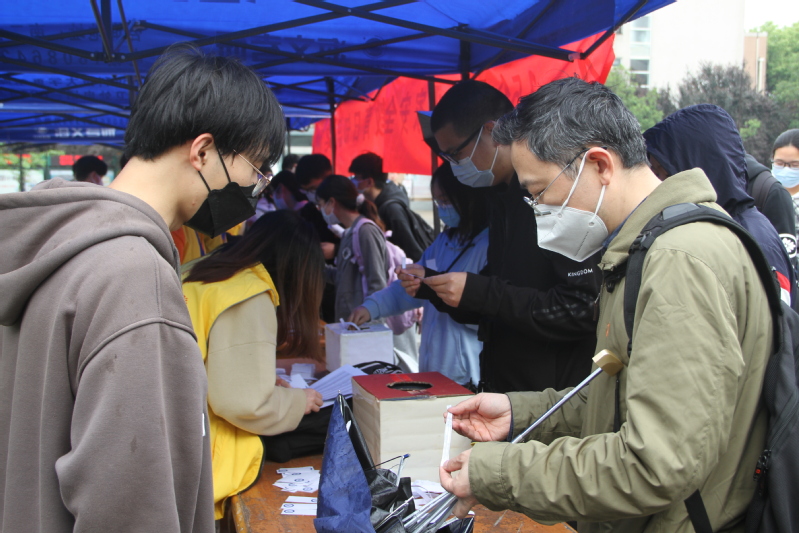 在南苑食堂门前,学生安全自治委员会志愿者们身着黄色马甲,佩戴口罩,站立在各个抽奖点、兑奖点、宣传点前,等候着同学的参与。即使天空飘起了小雨,同学们仍然井然有序地排起了长队。本次有奖问答活动采用抽题问答、现场兑奖的形式进行,以吸引学生们主动前来了解国家安全知识。
