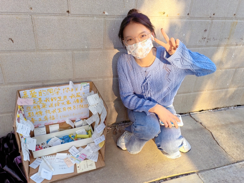 纸箱的主人是来自管理学院营销管理1902班的韦芳,她了解到身边的同学因为校园疫情防控不能外出,身边活动比较单一,又恰逢自己的生日,希望以特别方式在生日当天给大家单调的生活增添一点色彩。“疫情挡不住我们发现美的热情,也拦不住我们对生活的热爱。希望我的小小心意能够给更多人带去温暖。”