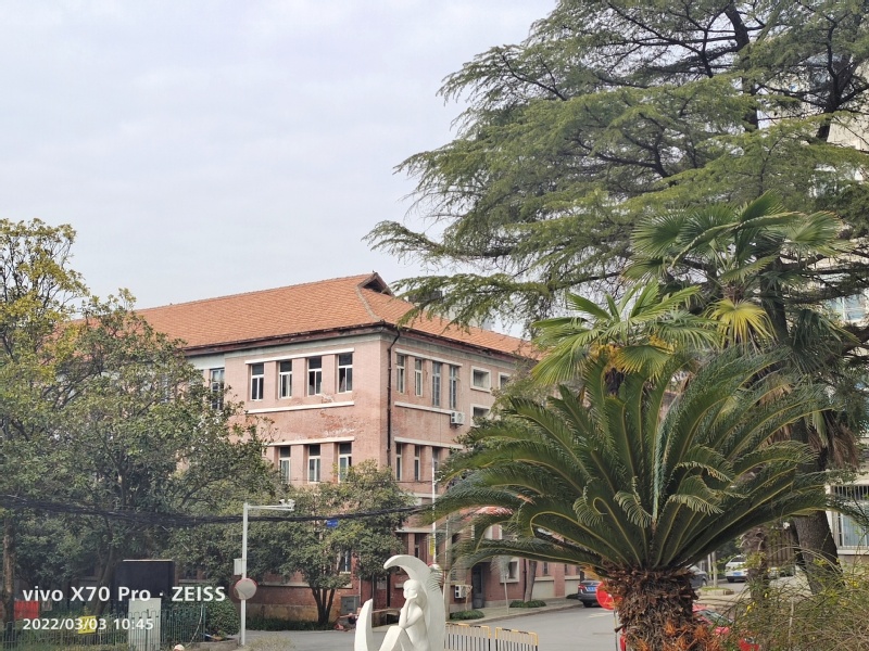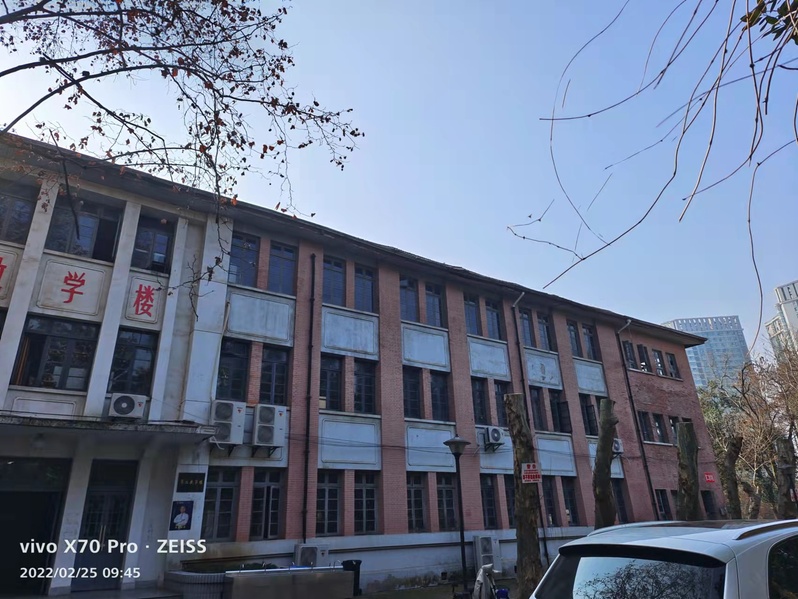 从位于雄楚大道的学校一号门进来,高大的香樟树和白玉兰分列在道路两旁,枝繁叶茂。一眼望去,校区树木林立,郁郁葱葱。沿着宽阔的马路走了两百米远,我们来到一座小花园。这是学校的中心花园,虽然面积不大,却小巧精致,有假山、喷泉、廊道,树木密布,四季鲜花盛开。我们来到花园的西侧,一栋红墙红瓦的建筑映入眼帘,这便是教一栋。