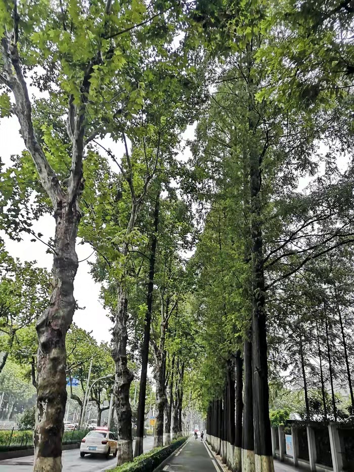 第一道林荫布设在主干道与辅路之间的隔离带上,这道林荫不仅美观,还承担着安全和吸尘功能,故其设计十分复杂。绿植共分六个层级,最高层级便是大型乔木——法国梧桐,它粗壮高大,遮天蔽日。据说是上个世纪六七十年代所栽种,沧桑半世纪,长得格外壮硕,树干有五六层楼那么高,粗的须两人才可合抱过来。清一色的白色主干,雄赳赳地撑起巨大的树冠,沿着主干道“一”字摆开,犹如威严挺拔的皇家卫队擎起遮阳挡雨的华盖。