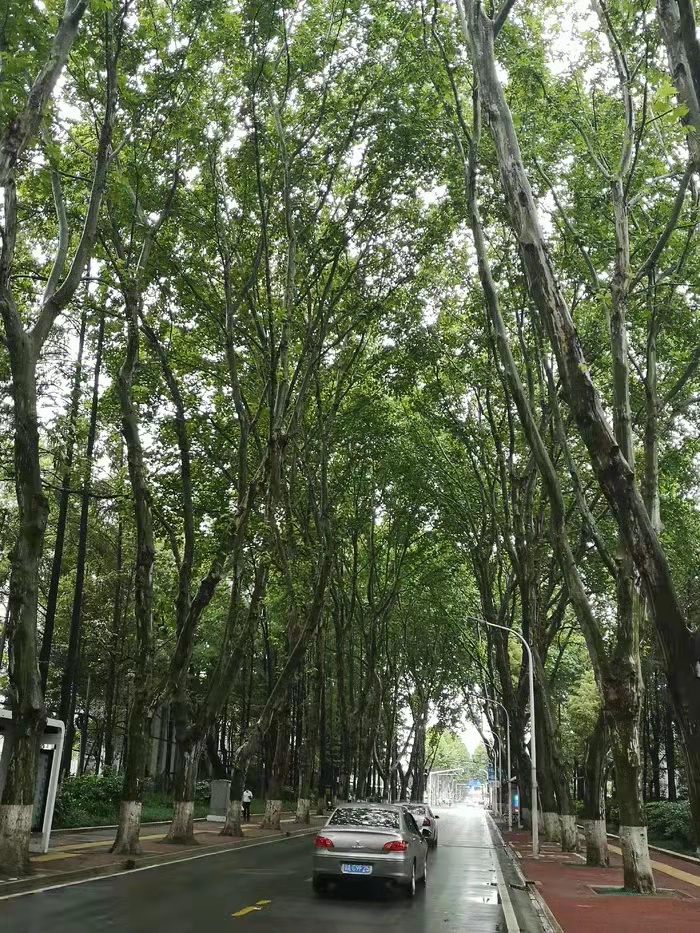 青山校区,因为最美林荫大道的存在,每到炎热的夏天,师生们走近学校大门,只觉温度骤然下降,仿佛进了空调房。满眼的绿色使烦躁的心情忽然沉静下来。秋天,那梧桐树的阔叶变得金黄,水杉的针叶也转为橘黄,双色交相辉映,犹如吉祥的哈达飘在空中,令人大饱眼福。