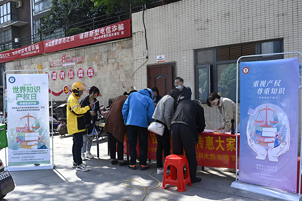 科普活动激发着来来往往居民的热情,拎着蔬菜的阿姨、带着孩子的老人、甚至闲暇的外卖小哥和社区工作人员都在此驻足。除了领取宣传单外,市民们还能够参与有奖竞答赢取精美礼品。随着宣传单的分发,不少居民对知识产权有了一定的了解,纷纷围在宣传桌前积极询问。