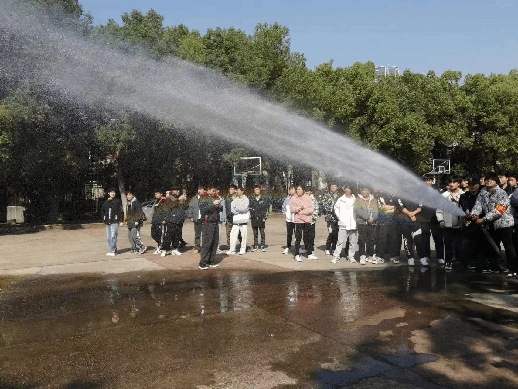 消防站官兵现场进行消防器材展示,为师生员工详细介绍了逃生绳、消防栓、防火面罩、消防战斗服等消防器材的基本功能和使用方法,现场进行消防车出水灭火展示。学生积极参与防火面罩试戴、消防战斗服试穿和消防栓使用训练,现场氛围热烈,师生参与度高。