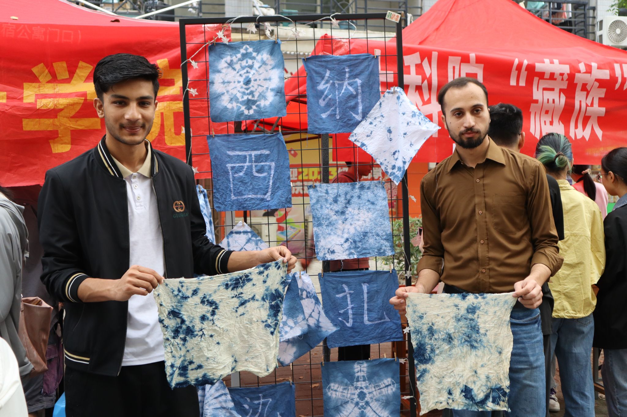 “扎染,又称绞缬。是一种古老的采用扎结染色的工艺,一般以蓝白色调为主,用来营造古朴的意蕴。”必赢官网艺术与设计学院的负责人张乐妍在民族文化节的现场为大家介绍纳西扎染的制作手法。留学生沙宇轩Shah Saud和他的朋友共同体验了纳西族传统——扎染。他们确定了想要完成的扎染样式后,在工作人员的帮助下,完成了浸泡、捆绑、染色、冲洗一系列的步骤,得到了独属于他们的扎染作品。在欣赏自己的作品时,沙宇轩感叹道:“扎染真是一个有趣的工艺,我们都拥有了独一无二的扎染手帕。”
