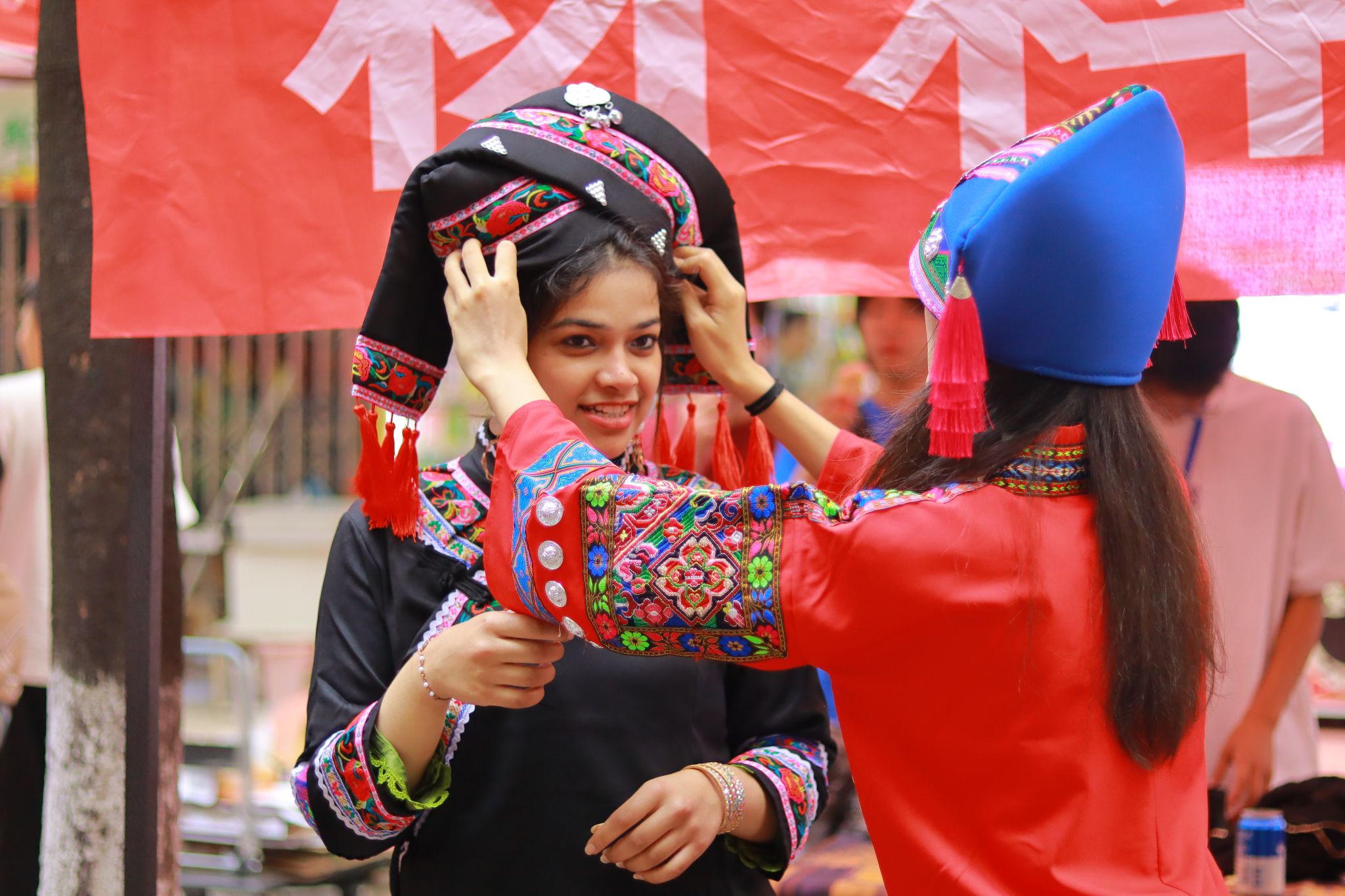 同样是巴基斯坦留学生的Qimo感慨道:“我爱中国,我爱这些有趣的文化。今天在民族文化节上我换上了壮族的服饰,这和巴基斯坦的衣服很不一样,但它非常漂亮。中国人很友好,热情地与我们分享美食,我很开心和大家度过了愉快的一天。”