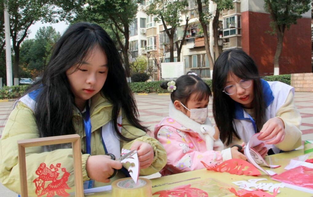 志愿者们在社区中央广场开展剪纸教学活动,向小朋友们普及中国传统艺术知识,通过生动有趣的讲解带领他们感受剪纸这门传统艺术的魅力,发掘他们的想象力与创造力。借以各式各样的精美剪纸样品,志愿者们细致耐心地教授孩子们不同图案的剪纸方法,让他们近距离感受普通纸张成为艺术品的神奇变化。