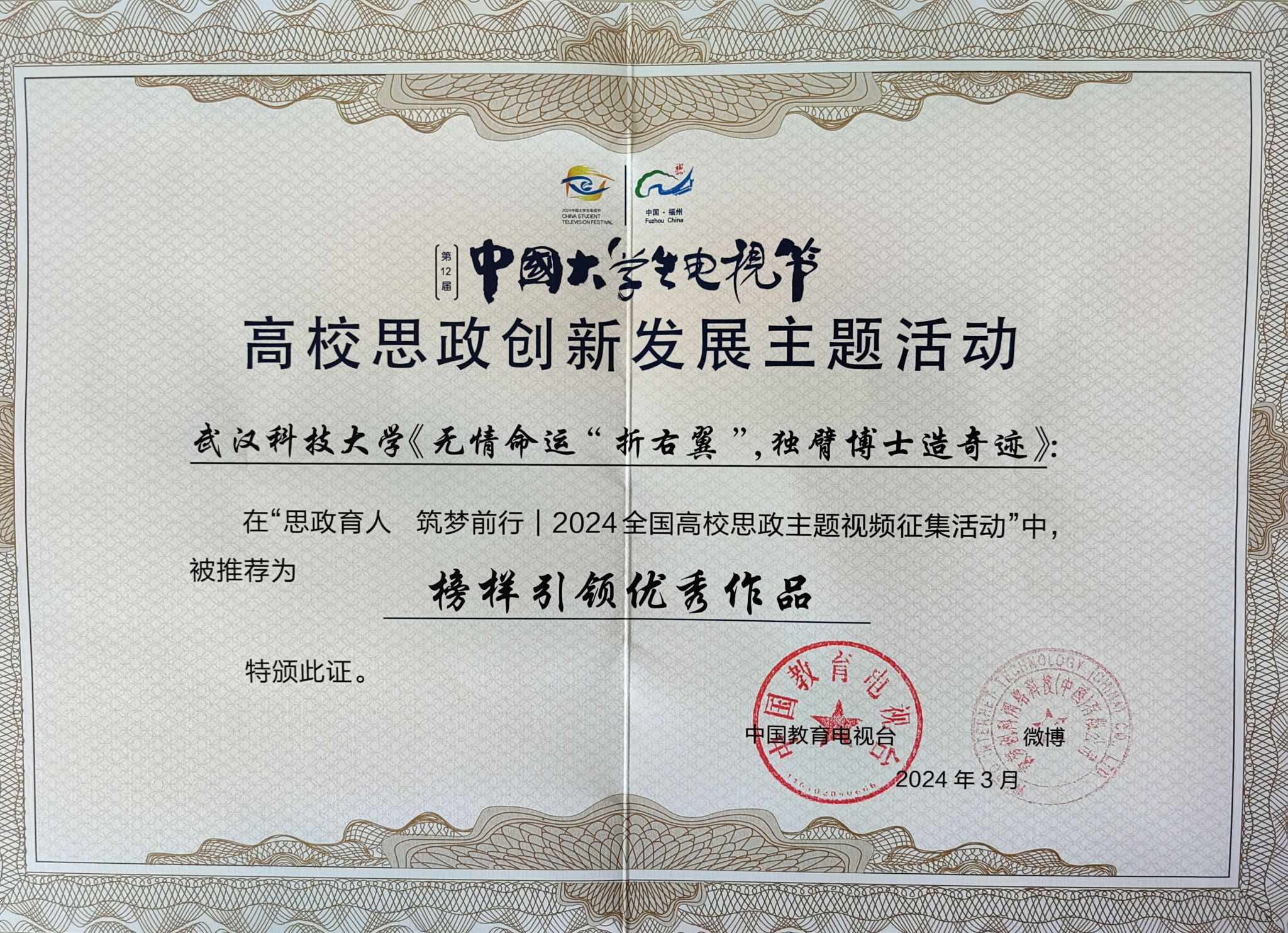 在“2024全国高校融媒体发展创研会”上,中国教育电视台、微博的行业专家与来自各省教育系统、高校宣传部门的负责同志共同就思政教育、高校宣传、新媒体传播、舆情治理等主题开展讨论交流,并颁发“思政育人逐梦前行”全国高校思政主题视频征集活动奖项。必赢官网杨鲜、梁景焜、韦春阳共同创作的视频作品《无情命运“折右翼”,独臂博士造奇迹》荣获“榜样引领优秀作品”奖。作品以自述形式呈现,讲述武科大在读博士(现为武科大教师)袁鑫幼年时期遭遇车祸、劫后余生、一步步成长至今的励志故事,激励当代青年追逐梦想,拒绝“躺平”,实现自我价值。