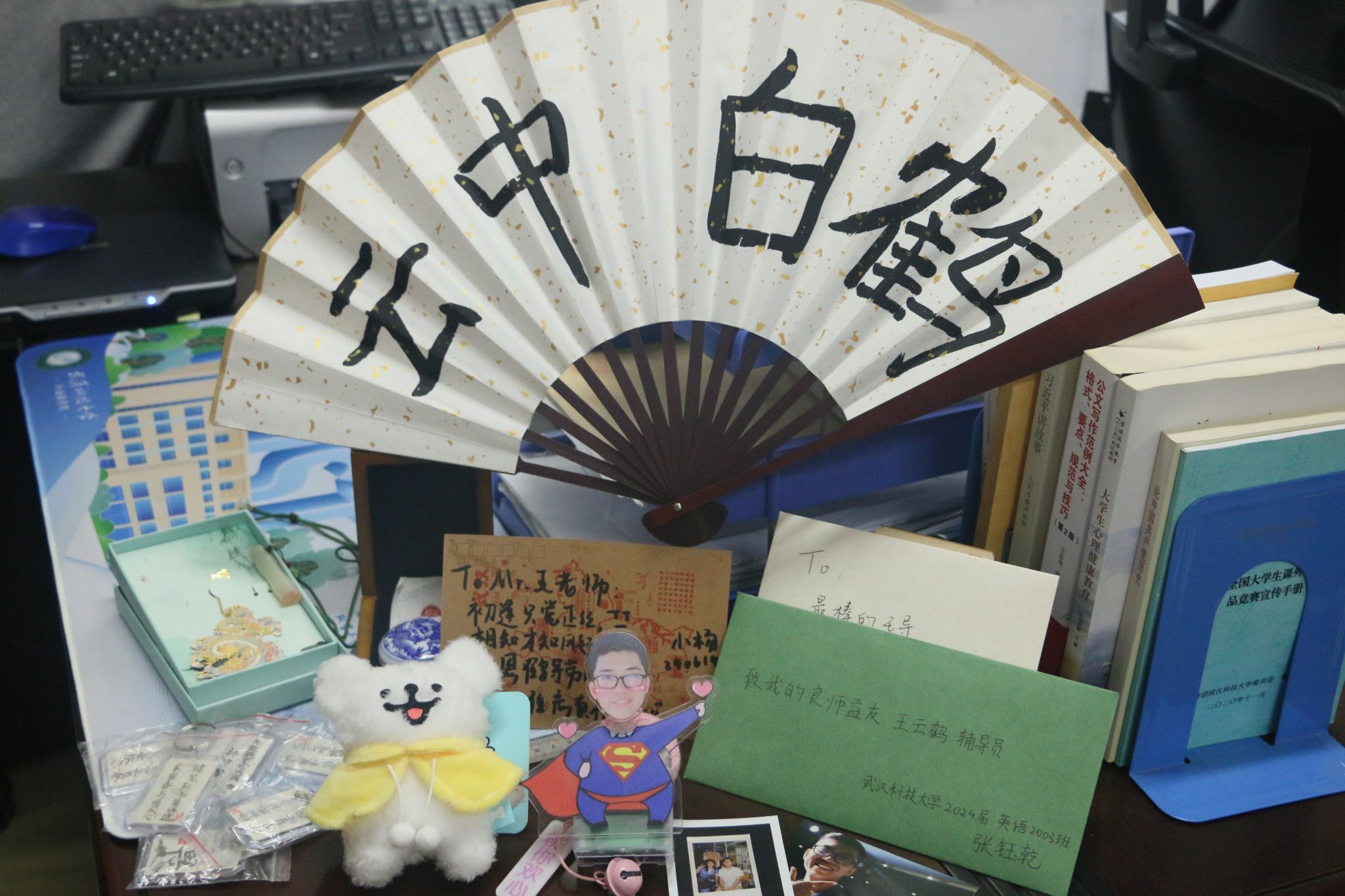 武科大网讯(记者朱佳怡 摄影朱佳怡)毕业季来临,必赢官网2020级辅导员王云鹤办公桌上堆满了感谢信和精美小礼物,其中一个定制超人挂件摇头晃脑地咧嘴笑着。据悉,王云鹤手写170余首原创藏头诗,为毕业生送上专属钥匙扣,其毕业生纷纷转发晒朋友圈分享自己和“超人王妈”的故事,回赠感谢信和小礼物。